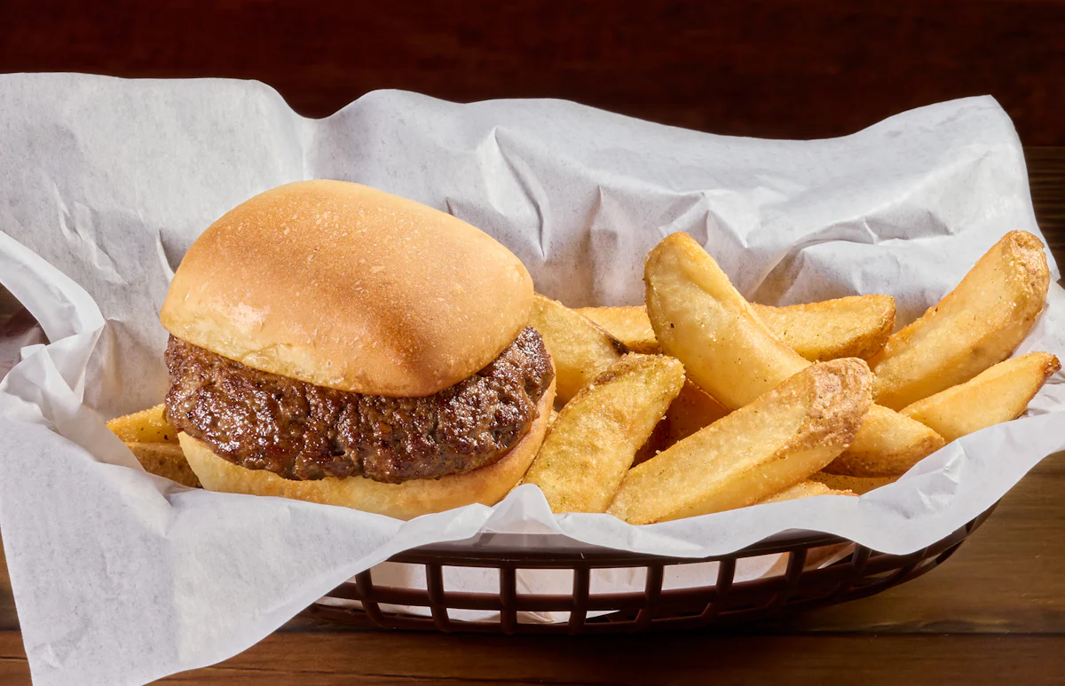 Tender, slow-cooked BBQ pulled pork served on a Texas-sized bun with steak fries and a pickle spear.
