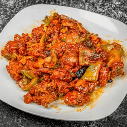 Boneless chicken battered with spices and sauteed with onion tomato and green pepper