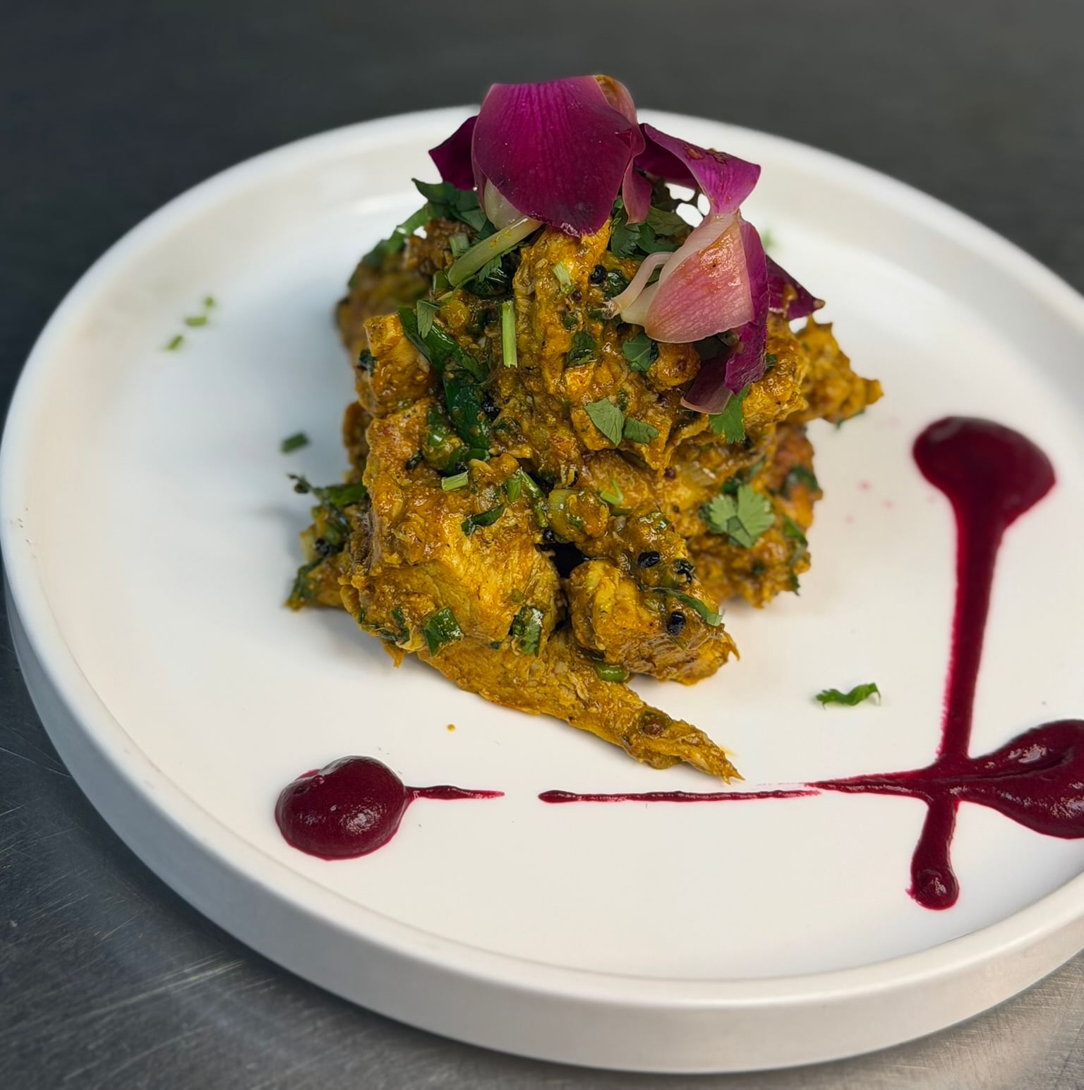 Atlantic salmon cooked in a homemade sauce and finished with fenugreek leaf.