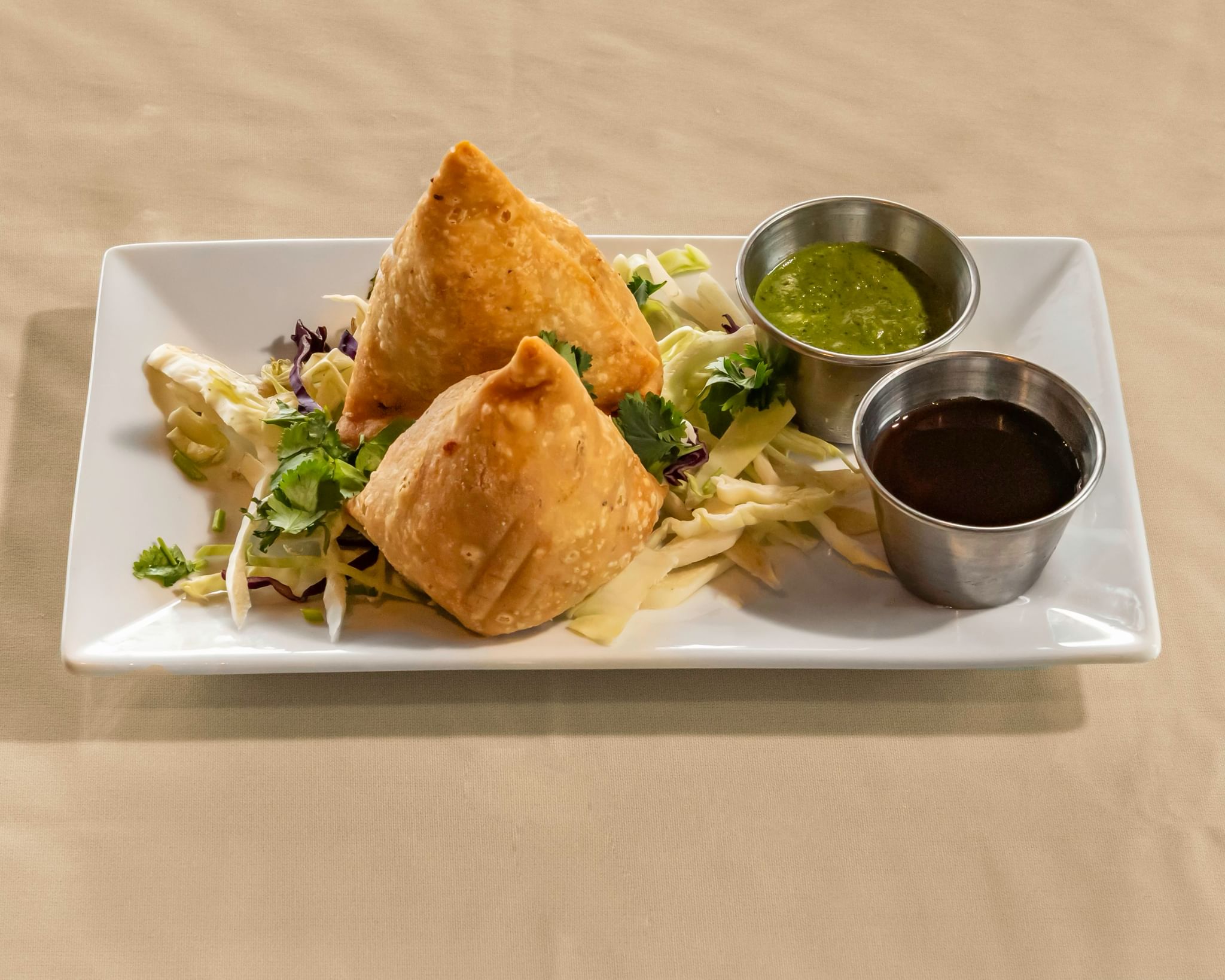 Vegetarian turnover stuffed with potatoes, peas, spices, herbs, and served with tamarind sauce.