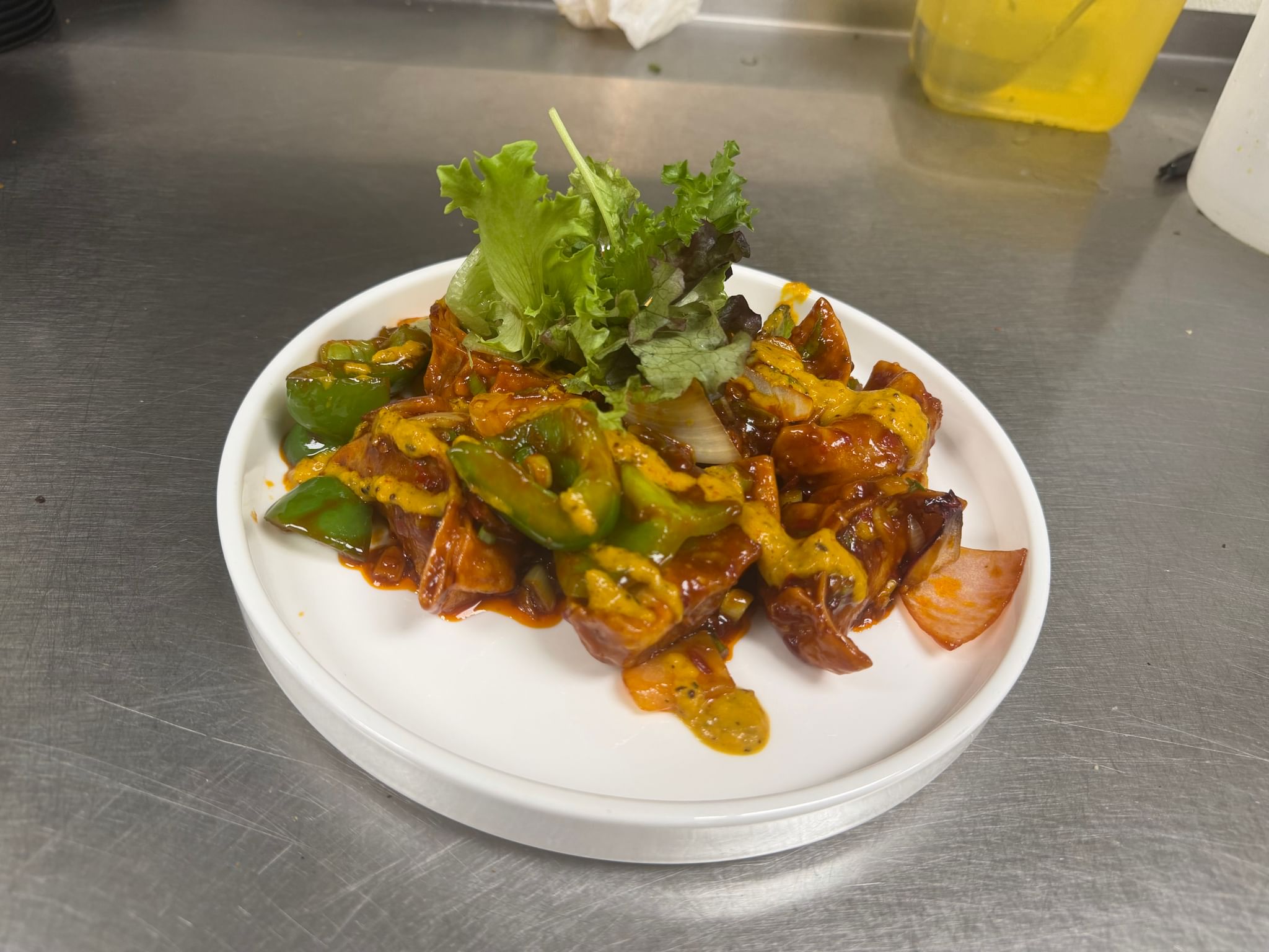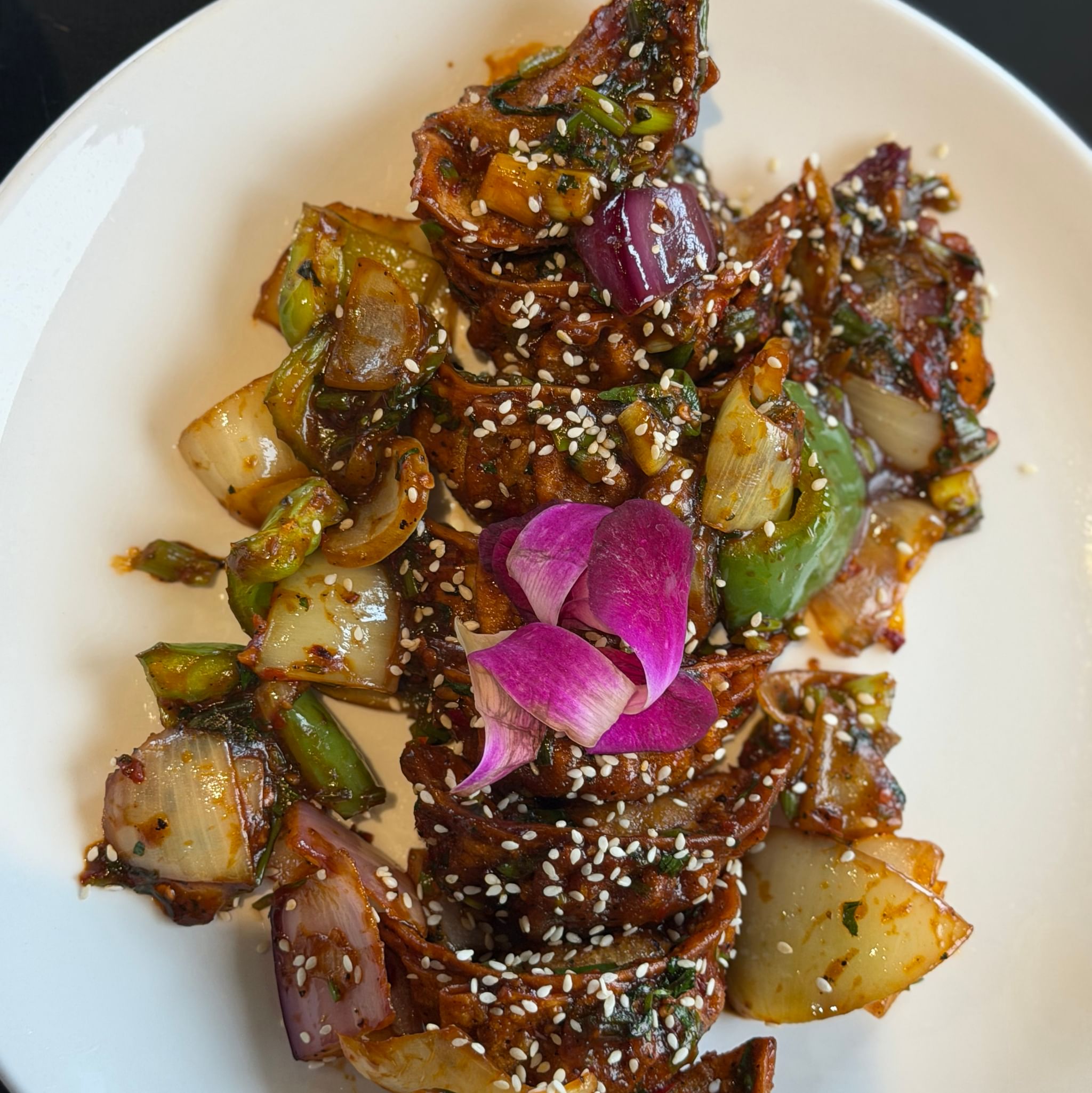 Pan-fried Momo toasted with chili soy sauce and tomato, diced green pepper and onion paneer, and soy chili sauce. Fire roasted chicken with Newari-style spice.