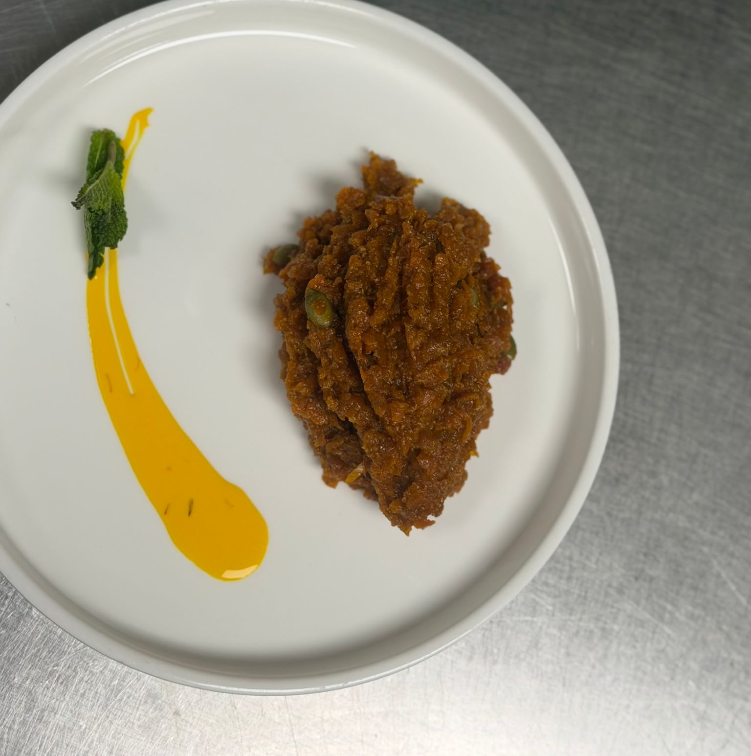 Lamb cooked with South Indian-style sauce and finished with coconut sauce.