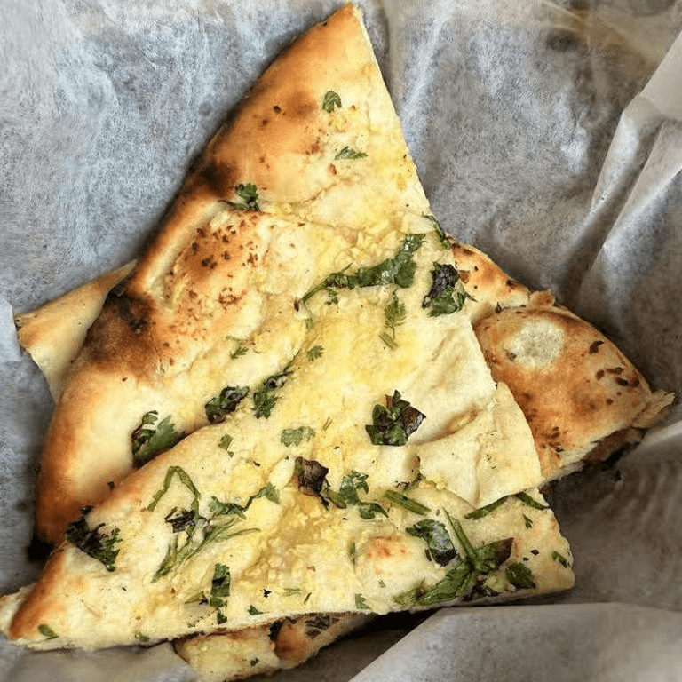 Naan topped with chopped garlic and cilantro leaves, baked in tandoor.