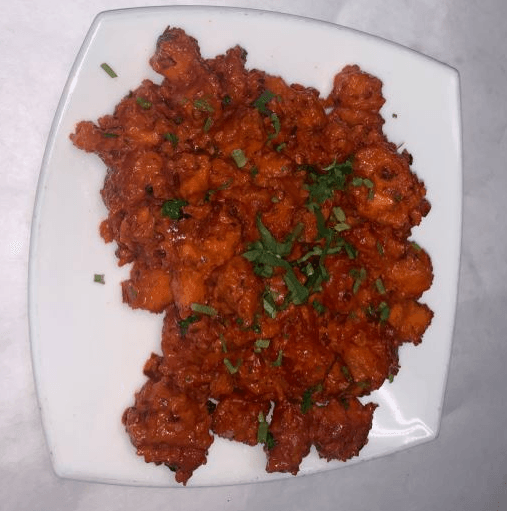 Cauliflower fried in spiced rice flour & cornstarch batter then cooked in sweet & sour sauce with bell pepper & onion