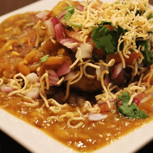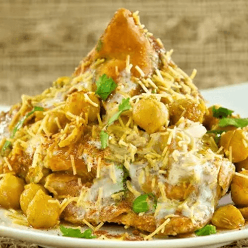 Veg samosa covered with chana masala (garbanzo beans), spices, diced onions, diced tomatoes, tamarind & mint chutney
