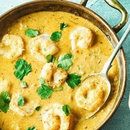 Shrimp cooked in cream sauce with cashews and raisins