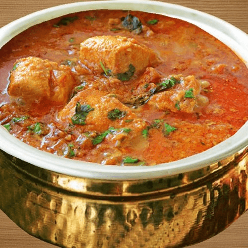Chicken cooked with spices in a thick curry sauce